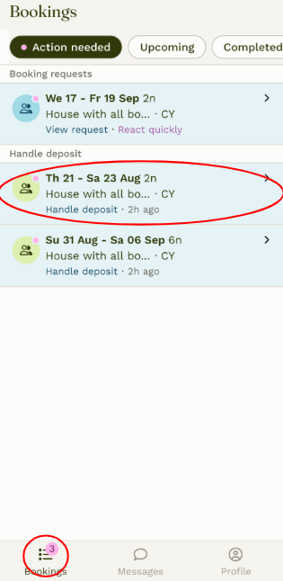 Under ‘Action required’, you can find pending bookings and bookings for which the deposit still needs to be handled.