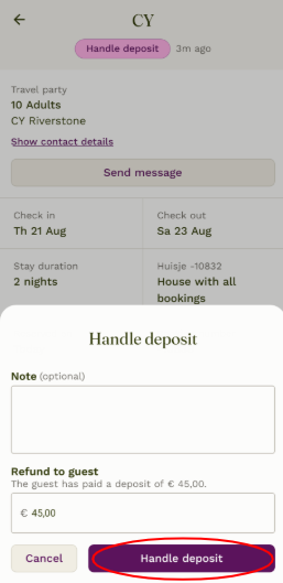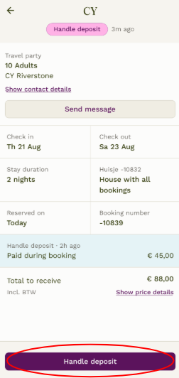 Click on the booking for which you need to handle the deposit, and then in the booking overview press the ‘Handle deposit’ button.