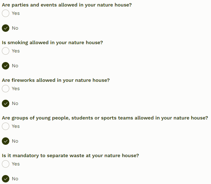 To help you on your way we have already added a few house rules. Which you can change by ticking 'yes' or 'no'. If you have extra rules for your nature house you can add them by clicking on the button '+ add a house rule'.